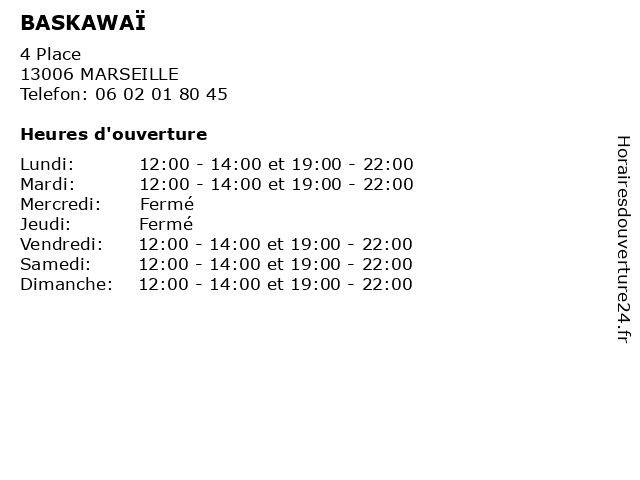| Dimanche | 12:00-14:00 et 19:00-22:00 |