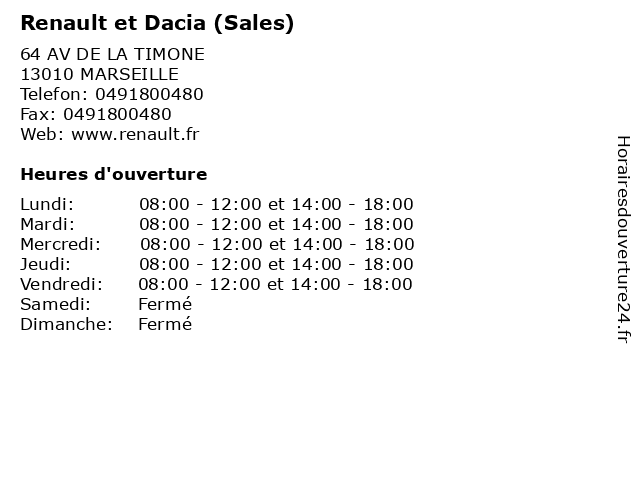 1 Renault et Dacia (Atelier Mécanique) (Distance: 0,00 km) 64 AV DE LA TIMONE, 13010 MARSEILLE atelier, concessionnaire automobile, constructeur automobile, dacia, et, multinationale, mécanique, renault, voitures 2 Renault et Dacia (Atelier Carrosserie) (Distance: 0,00 km) 64 AV DE LA TIMONE, 13010 MARSEILLE atelier, carrosseri, carrosserie, concessionnaire automobile, constructeur automobile, dacia, et, multinationale, renault, voitures 3 Renault et Dacia (Assistance 24h) (Distance: 0,00 km) 64 AV DE LA TIMONE, 13010 MARSEILLE 24h, assistance, concessionnaire automobile, constructeur automobile, dacia, et, multinationale, renault, voitures 4 Renault Retail Group (Sales) (Distance: 2,38 km) 134 BD MICHELET, 13008 MARSEILLE concessionnaire automobile, constructeur automobile, group, marseille, michelet, multinationale, renault, retail, sales, voitures 5 Renault Retail Group (Vante á clients professionnels) (Distance: 2,38 km) 134 BD MICHELET, 13008 MARSEILLE clients, concessionnaire automobile, constructeur automobile, group, marseille, michelet, multinationale, professionnels, renault, retail, vante, voitures 6 RENAULT MARSEILLE Saint Just / RRG (Renault Minute, Atelier Mécanique)) (Distance: 3,11 km) 10 RPT CLAUDIE DARCY, 13004 MARSEILLE atelier, concessionnaire automobile, constructeur automobile, just, marseille, minute, multinationale, mécanique, renault, rrg, saint, voitures |
