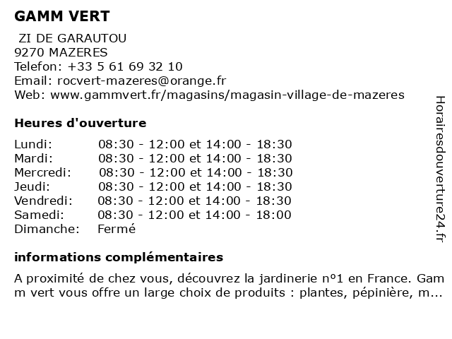 1 Gamm Vert (Distance: 1,74 km) 20 Route de Pamiers, 09270 Mazères animalerie, animaux, au, gamm, horticulteur, jardin, jardinerie, vert 4 GAMM VERT (Distance: 17,95 km) 13 Avenue François Mitterrand, 31290 Villefranche-de-Lauragais animalerie, gamm, jardin, jardinerie, mobilier de jardin, plantes, pépinière, vert 5 Roc Vert (Distance: 1,68 km) - ZI de Garaoutou, 09270 Mazères bricolage, jardin, materiel, roc, roc vert, vert 6 Chaubet Eau Vert Paysage SARL (Distance: 12,81 km) N20, 09100 Pamiers chaubet, eau, paysage, sarl, vert |