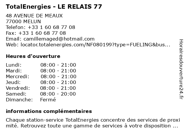 Termes de recherche pour TotalEnergies - LE RELAIS 77:relais, le, total, 77, gas station, station service, tankstelle, totalenergies |