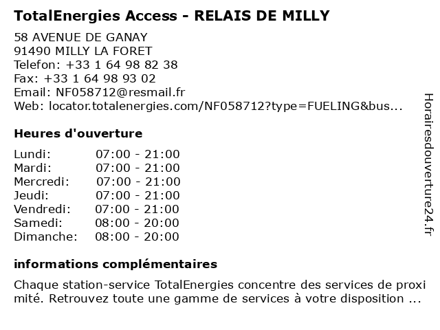 Termes de recherche pour TotalEnergies Access - RELAIS DE MILLY:relais, de, access, total, milly, gas station, station service, tankstelle, totalenergies |
