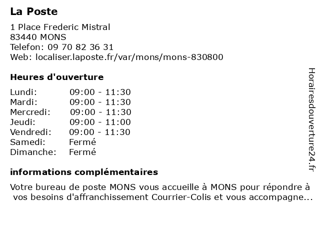 1 La Poste (Distance: 8,07 km) 25 Montée des Ferrages, 83440 Seillans agence, assurance, banque, banque postale, bureau de poste, chronopost, colis, courrier, dps, expéditions internationales, la, point, postale, poste, relais, timbres, téléphonie, ups, western union 3 La Poste (Distance: 12,57 km) - Route de Draguignan, 06530 Le Tignet agence postale, courrier postal, expédition internationale, la, poste 4 La Poste (Distance: 13,91 km) 161 Place du Champ de Foire, 83440 Saint-Paul-en-Forêt agence, assurance, banque, banque postale, bureau de poste, chronopost, colis, courrier, dps, expéditions internationales, la, point, postale, poste, relais, timbres, téléphonie, ups, western union 5 La Poste (Distance: 14,67 km) 1 Avenue du Belvédère, 06750 Andon agence postale, courrier postal, expédition internationale, la, poste 6 La Poste (Distance: 14,75 km) - Route de Bagnols, 83600 Fréjus agence postale, courrier postal, expédition internationale, la, poste |
