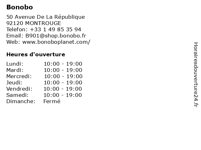 1 Bonobo (Distance: 5,70 km) 30 Boulevard Paul Vaillant-Couturier, 94200 Ivry Sur Seine bonobo, enfant, femme, homme, jeans, mode 2 Bonobo (Distance: 6,98 km) . Rue de la Loge, 94260 Fresnes bonobo, cafe, chaussures, enfants, homme, lingerie, mode femme, restaurant 6 Bonobo (Distance: 10,02 km) 15 Parvis de la Défense, 92092 Paris La Défense bonobo, chaussures, lingerie, mode enfant, mode femmes, mode hemmes, sport |