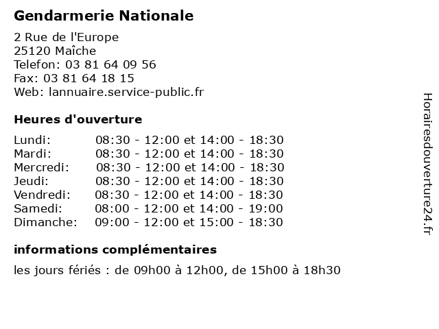 1 Gendarmerie Nationale (Distance: 8,54 km) 4 Rue du Clos des Fourches, 25190 Saint-Hippolyte brigade, commandant, communauté, gendarme, gendarmerie, nationale, proximité, sécurité 2 Gendarmerie Nationale (Distance: 11,33 km) 14 Rue du Maréchal Leclerc, 25210 Le Russey brigade, commandant, communauté, gendarme, gendarmerie, nationale, proximité, sécurité 3 Gendarmerie Nationale (Distance: 11,83 km) 33 Grande Rue, 25380 Belleherbe brigade, commandant, communauté, gendarme, gendarmerie, nationale, proximité, sécurité 4 Gendarmerie Nationale (Distance: 16,23 km) 28 Rue des Bouleaux, 25150 Pont-de-Roide brigade, commandant, communauté, gendarme, gendarmerie, nationale, proximité, sécurité 5 Gendarmerie Nationale (Distance: 16,41 km) 43 Grande Rue, 25310 Blamont brigade, commandant, communauté, gendarme, gendarmerie, nationale, proximité, sécurité 6 Gendarmerie Nationale (Distance: 18,09 km) 1 Rue Sous-les-Chênes, 25430 Sancey-le-Grand brigade, commandant, communauté, gendarme, gendarmerie, nationale, proximité, sécurité |