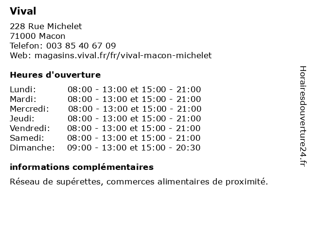 | 1 Vival (Distance: 1,72 km) 81-83 Rue de la Liberté, 71000 Mâcon supermarché, supérette, vival, épicerie 2 Vival (Distance: 5,15 km) 26 Allée du Clos du Puits, 71870 Hurigny alimentation, distributeur alimentaire, supermarché, supérette, vival, épicerie 3 Vival (Distance: 8,50 km) - Rue Marsale, 01380 Bâgé-le-Châtel alimentation, by, casino, distributeur alimentaire, supermarché, supérette, vival, épicerie 4 Vival (Distance: 15,59 km) - Place de l'Église, 69820 Fleurie alimentation, distributeur alimentaire, superette, supermarché, vival, épicerie 5 6 Vival (Distance: 18,70 km) . Grande Rue, 71260 Lugny alimentaire, discount, distributeur, distribution, fruits, grande, hypermarché, légumes, supermarché, vival, épicerie |