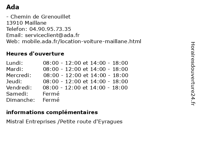 1 Ada (Distance: 4,55 km) 6 Traverse des Chardons, 13210 Saint Rémy de Provence ada, agence, location, services, utilitaires, voitures, voyages 2 Ada (Distance: 10,18 km) - Place de l'Europe, 84000 Avignon ada, agences, demenagement, location, vehicules, voitures 3 Ada (Distance: 10,92 km) 3017 Route de Marseille, 84140 Montfavet ada, camions, fourgonnettes, location de voiture, monospace, services, véhicules, véhicules utilitaires 4 Ada (Distance: 18,81 km) 288 Avenue du Pont, 84300 Cavaillon ada, camions, fourgonnettes, location de voiture, monospace, services, véhicules, véhicules utilitaires 5 ADA (Distance: 21,56 km) 13 Avenue de Stalingrad, 13200 Arles ada, auto, location de voiture, roulez, vehicules 6 ADA (Distance: 21,58 km) . Avenue Paulin Talabot, 13200 Arles ada, auto, location de voiture, roulez, vehicules |