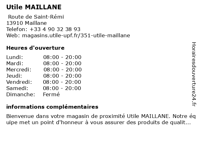 1 UTILE SAINT-RÉMY-DE-PROVENCE (Distance: 6,16 km) 48 Avenue Durand Maillane, 13210 Saint-Rémy-de-Provence de, provence, rémy, saint, utile 2 Utile Supermarché (Distance: 7,69 km) 12 Avenue Roger Salengro, 13160 Châteaurenard alimentation, fruits, légumes, supermarché, supérette, utile, épicerie 3 UTILE CHÂTEAURENARD (Distance: 7,69 km) 12-14 Avenue Roger Salengro, 13160 Châteaurenard châteaurenard, utile 5 Utile Supermarché (Distance: 8,19 km) 11 Le Cours, 13570 Barbentane alimentation, supermarché, supérette, utile, épicerie 6 |