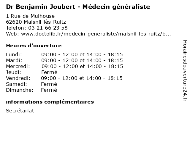 | Mercredi | 09:00-12:00 et 14:00-18:15 |