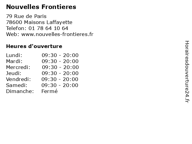1 Nouvelles Frontieres (Distance: 7,68 km) 15 Rue Desfresne Bast, 95100 Argenteuil agence, billets, frontieres, nouvelles, voyages 2 Nouvelles Frontieres (Distance: 8,19 km) 50-54 Rue St Denis, 92700 Colombes agence, billets, frontieres, nouvelles, voyages 3 Nouvelles Frontieres (Distance: 8,25 km) 26 Rue Hervet, 92500 Rueil Malmaison agence, billets, frontieres, nouvelles, voyages 4 Nouvelles Frontieres (Distance: 9,08 km) 15 Parvis de la Défense, 92092 Paris La Défense chaussures, frontieres, lingerie, mode enfant, mode femmes, mode hemmes, nouvelles, sport 5 Nouvelles Frontieres (Distance: 11,89 km) 68 Rue Aristide Briand, 92300 Levallois Perret agence, billets, frontieres, nouvelles, voyages 6 Nouvelles Frontieres (Distance: 12,85 km) 6 Place Tristan Bernard, 75017 Paris agence, billets, frontieres, nouvelles, voyages |