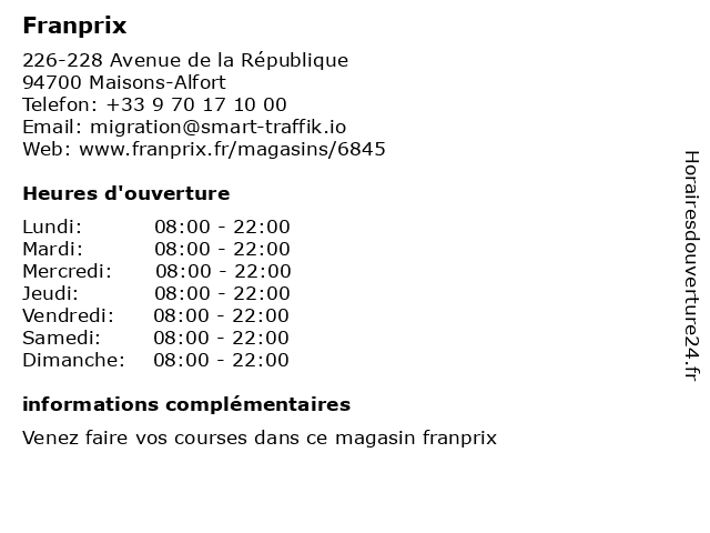1 Franprix (Distance: 0,77 km) 222 Rue du Maréchal Leclerc, 94410 Saint-Maurice alimentaire, alimentation, courses, franprix, supermarché, supérette, épicerie 2 Franprix (Distance: 0,93 km) 60 Avenue Gambetta, 94700 Maisons-Alfort bibi, carte de fidélité, courses, franprix, magasin, produits frais, programme de fidélité, supermarché, épicerie 3 Franprix (Distance: 1,01 km) 2 Rue des Réservoirs, 94410 Saint-Maurice alimentaire, alimentation, courses, franprix, supermarché, supérette, épicerie 4 Franprix (Distance: 1,18 km) 78-80 av. du Général Leclerc, 94700 MAISONS ALFORT alimentation générale, entretien de la maison et de l'hygiène, franprix, franprix magasin, fruits et légumes frais 5 Franprix (Distance: 1,20 km) 4-6 Rue de la Varenne, 94100 Saint-Maur-des-Fossés bibi, carte de fidélité, courses, franprix, magasin, produits frais, programme de fidélité, supermarché, épicerie 6 Franprix (Distance: 2,83 km) 90-90 bis Rue Paul Vaillant Couturier, 94140 Alfortville bibi, carte de fidélité, courses, franprix, magasin, produits frais, programme de fidélité, supermarché, épicerie |
