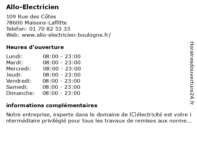 1 Allo-Electricien (Distance: 12,82 km) 26 Avenue Jean Jaurès, 92100 Boulogne-Billancourt allo, dépannage, electricien, entreprise, rénovation, tableau, urgence, électricité, électrique 2 Allo-Electricien (Distance: 16,65 km) 101 Rue de Sèvres, 75006 Paris allo, dépannage, electricien, entreprise, rénovation, tableau, urgence, électricité, électrique 3 Allo-Electricien (Distance: 17,40 km) 54 Rue de l'Ouest, 75014 Paris allo, dépannage, electricien, entreprise, rénovation, tableau, urgence, électricité, électrique 4 Allo-Electricien (Distance: 18,86 km) 14 Rue Charles V, 75004 Paris allo, dépannage, electricien, entreprise, rénovation, tableau, urgence, électricité, électrique 5 Allo-Serrurier (Distance: 0,00 km) 109 Rue Côtes, 78600 Maisons-Laffitte allo, assistance, dépannage, entreprise, installation, serrures, serrurier, urgence 6 Allo Radio Taxis du Parc (Distance: 0,90 km) 54 Rue du Tir, 78600 Maisons-Laffitte allo, du, parc, radio, taxis |