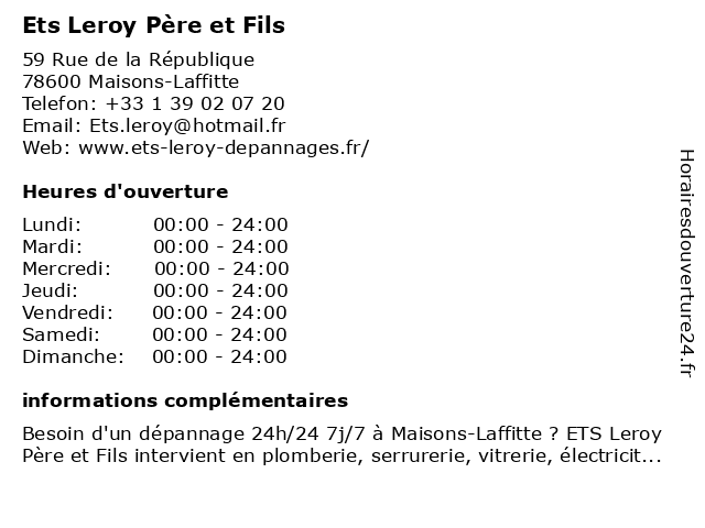 1 Ets Leroy Père et Fils (Distance: 1,50 km) 162 Av République, 78500 Sartrouville et, ets, fils, leroy, père 2 Ets Leroy Père et Fils (Distance: 6,08 km) 5 Rue de la Procession, 78100 Saint-Germain-en-Laye et, ets, fils, leroy, père 3 Ets Leroy Père et Fils (Distance: 6,74 km) 56 Rue Désiré Clément, 78700 Conflans-Sainte-Honorine et, ets, fils, leroy, père 4 Ets Leroy Père et Fils (Distance: 8,56 km) 61 Avenue Anatole France, 92700 Colombes et, ets, fils, leroy, père 5 Ets Leroy Père et Fils (Distance: 10,52 km) 176 Rue Paul Doumer, 78510 Triel sur seine et, ets, fils, leroy, père 6 Ets Leroy Père et Fils (Distance: 15,51 km) 15 Rue Montbauron, 78000 Versailles et, ets, fils, leroy, père |