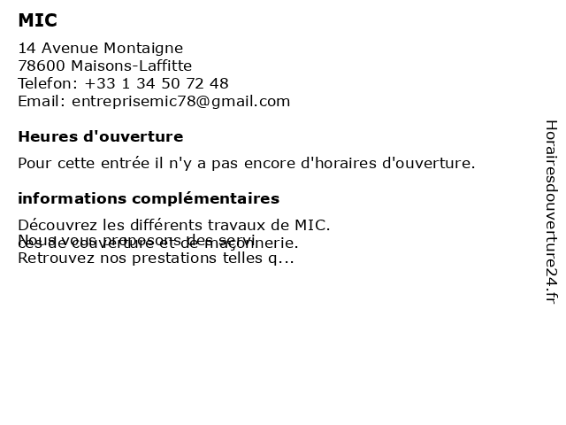 1 Mic Mac (Distance: 12,82 km) 10 Pierre Demours, 75017 Paris divertissement, jouets, juguetes, mac, mic 2 O Mic Mac (Distance: 30,38 km) 10 Place Jean Mermoz, 93370 Montfermeil boulangeries, distribution, détail, mac, mic |