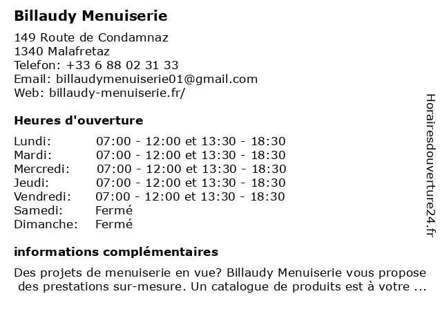 1 Transport et Travaux Publics Billaudy (Distance: 0,02 km) 159 route de Condamnaz, 01340 Malafretaz billaudy, et, publics, transport, travaux 2 Menuiserie Beal (Distance: 3,10 km) 62 chemin des Curtis, 01340 Montrevel-en-Bresse bains, beal, cuisines, escaliers, fabrication, menuiserie, rénovation 3 Glb Menuiserie (Distance: 13,18 km) 225 Rue de l'Industrie, 01440 Viriat fabricant, glb, menuiserie, meuble, viriat 4 Menuiserie Roux et Fils (Distance: 13,70 km) 3345 Route de Montrevel, 01380 Bâgé-la-Ville bâgé-la-ville, charpentier, et, et fils, fils, menuiserie, roux 5 Menuiserie Raffin Rouge (Distance: 13,81 km) 216 Chemin vers le Mont, 01000 Saint-Denis-lès-Bourg menuiserie, raffin, rouge 6  |
