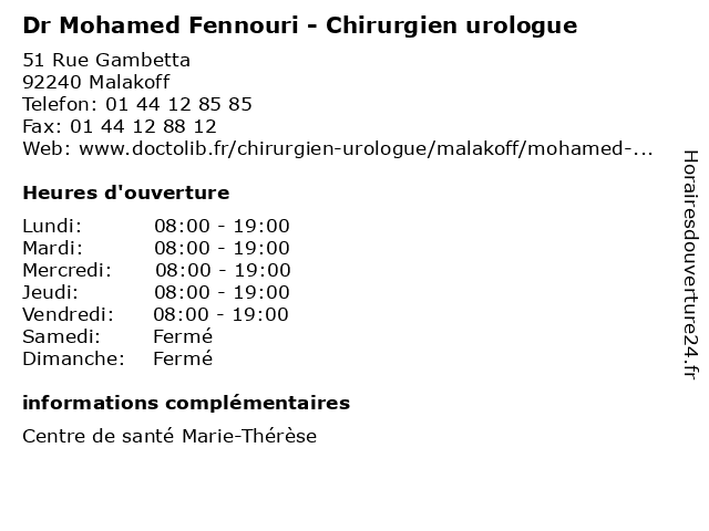 1 Dr Mohamed Fennouri - Chirurgien urologue (Distance: 0,88 km) 189 Rue Raymond Losserand, 75014 Paris centres, chirurgien, de, docteur, dr, fennouri, generaliste, marie, medical, mohamed, santé, soin, thérèse, urologue 2 Dr Abdelslam Mohamed Hadj - Rhumatologue (Distance: 0,00 km) 51 Rue Gambetta, 92240 Malakoff abdelslam, dr, hadj, mohamed, médecin, médecine, médical, pharmaceutique, rhumatologue, traitement 3 Dr Josselin Malaterre - Chirurgien urologue (Distance: 0,00 km) 51 Rue Gambetta, 92240 Malakoff chirurgien, dr, josselin, malaterre, médecin, médecine, médical, pharmaceutique, traitement, urologue 4 Dr Constance Michel - Chirurgien urologue (Distance: 1,19 km) 5 Rue Amaury Duval, 92120 Montrouge chirurgien, constance, consultation, docteur, dr, med, michel, médecin, médecine, traitement, urologue 5 Mohamed Zaid - Hypnothérapeute (Distance: 1,59 km) 8 Rue Beaunier, 75014 Paris consultation, docteur, hypnothérapeute, med, mohamed, médecin, traitement, zaid 6 Dr Xavier Cathelineau - Chirurgien urologue (Distance: 1,71 km) 42 boulevard Jourdan, 75014 Paris cathelineau, chirurgien, consultation, docteur, dr, med, médecin, traitement, urologue, xavier |
