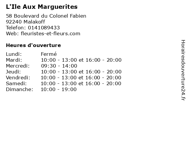 | Vendredi | 10:00-13:00 et 16:00-20:00 |