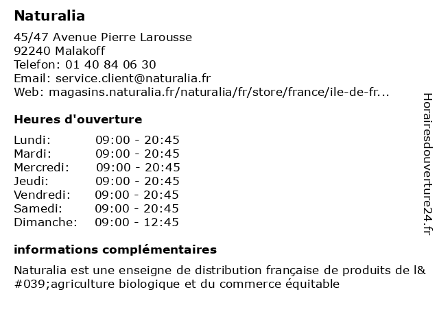 | 1 Naturalia (Distance: 2,00 km) 13 Rue Brézin, 75014 Paris alimentaire, alimentation, bio, biologique, magasin, naturalia, produits, supermarché, épicerie 2 Naturalia (Distance: 2,24 km) 86 Rue de Cambronne, 75015 Paris alimentaire, alimentation, bio, biologique, magasin, naturalia, produits, supermarché, épicerie 3 Naturalia (Distance: 2,28 km) 105 rue Lecourbe, 75015 Paris bio, boissons, epicerie, fruits, légumes, naturalia, produits 4 Naturalia (Distance: 3,38 km) 13-15 rue Brillat Savarin, 75013 Paris alimentaire, alimentation, bio, biologique, magasin, naturalia, produits, supermarché, épicerie 5 Naturalia (Distance: 3,66 km) 38 Avenue de la Motte Picquet., 75007 Paris alimentaire, alimentation, bio, biologique, magasin, naturalia, produits, supermarché, épicerie 6 Naturalia (Distance: 5,04 km) 186 Rue Houdan, 92330 Sceaux boulangerie, bébé, cosmétique, enfant, epicerie salée, epicerie sucrée, hygiène, naturalia |
