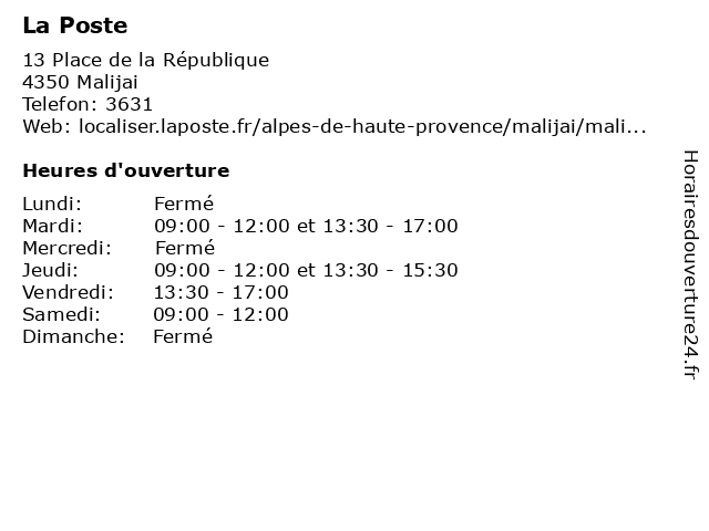 1 La Poste (Distance: 4,05 km) 15 Rue Henri Merle, 04600 Saint-Auban agence, assurance, banque, banque postale, bureau de poste, chronopost, colis, courrier, dps, expéditions internationales, la, point, postale, poste, relais, timbres, téléphonie, ups, western union 2 La Poste (Distance: 4,49 km) - Rue du Professeur François Arnaud, 04160 L'Escale agence, assurance, banque, banque postale, bureau de poste, chronopost, colis, courrier, dps, expéditions internationales, la, point, postale, poste, relais, timbres, téléphonie, ups, western union 3 La Poste (Distance: 5,68 km) n/a Chemin du Lac, 04160 Château-Arnoux-Saint-Auban agence, assurance, banque, banque postale, bureau de poste, chronopost, colis, courrier, dps, expéditions internationales, la, point, postale, poste, relais, timbres, téléphonie, ups, western union 4 La Poste (Distance: 7,59 km) - L'Houbeyron, 04510 Mallemoisson agence, assurance, banque, banque postale, bureau de poste, chronopost, colis, courrier, dps, expéditions internationales, la, point, postale, poste, relais, timbres, téléphonie, ups, western union 5 La Poste (Distance: 9,48 km) - Place de la Mairie, 04510 Le Chaffaut-Saint-Jurson agence, assurance, banque, banque postale, bureau de poste, chronopost, colis, courrier, dps, expéditions internationales, la, point, postale, poste, relais, timbres, téléphonie, ups, western union 6 La Poste (Distance: 9,87 km) - Le Village, 04310 Peyruis agence, assurance, banque, banque postale, bureau de poste, chronopost, colis, courrier, dps, expéditions internationales, la, point, postale, poste, relais, timbres, téléphonie, ups, western union |
