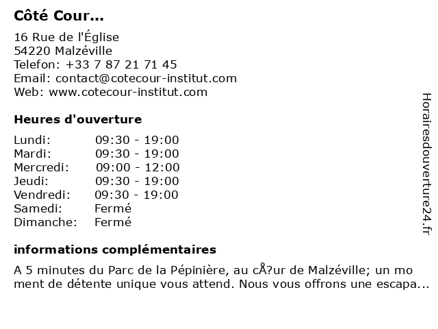 2 Cour Administrative d'Appel de Nancy (Distance: 1,51 km) 6 Rue du Haut Bourgeois, 54035 Nancy administrative, cour, d'appel, de, justice, nancy, public, services 3 De l'Autre Côté du Miroir (Distance: 1,80 km) 22 Cours Léopold, 54000 Nancy barbier, beauté, coiffeur, coiffure, côté, de, du, l'autre, miroir, salon 4 Cour d Appel De Nancy (Distance: 2,02 km) Cite Judiciaire Case Off 27, 54000 Nancy accusation, appel, cour, défense, nancy 5 Parking Zenpark (La Cour des Arts) (Distance: 2,05 km) 31 Rue Gambetta, 54000 Nancy arts, cour, des, la, parking, stationnement, zenpark 6 La Cour Des Arts (Distance: 2,13 km) 21b rue saint dizier, 54000 Nancy arts, bar, boissons., cour, des, la, nourriture, restaurant |