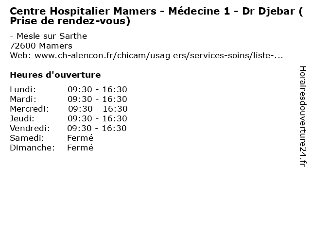 1 Centre Hospitalier Mamers - Médecine 1 - Dr Djebar (Distance: 0,00 km) - Mesle sur Sarthe, 72600 Mamers bureau, centre, consultation, djebar, dr, hospitalier, la maladie, la médecine, la pratique, mamers, med, médecin, médecine, thérapie, traitement 2 Centre Hospitalier Mamers - Oto-Rhino-Laryngologie (ORL) - Dr Dernis (Distance: 0,00 km) - Mesle sur Sarthe, 72600 Mamers bureau, centre, consultation, dernis, dr, hospitalier, la maladie, la médecine, la pratique, laryngologie, mamers, med, médecin, orl, oto, rhino, thérapie, traitement 3 Centre Hospitalier Mamers - Ophtalmologie - Dr Maillard (Distance: 0,00 km) - Mesle sur Sarthe, 72600 Mamers bureau, centre, consultation, dr, hospitalier, la maladie, la médecine, la pratique, maillard, mamers, med, médecin, ophtalmologie, thérapie, traitement 4 Centre Hospitalier Mamers - Ophtalmologie - Dr Tardif (Distance: 0,00 km) - Mesle sur Sarthe, 72600 Mamers bureau, centre, consultation, dr, hospitalier, la maladie, la médecine, la pratique, mamers, med, médecin, ophtalmologie, tardif, thérapie, traitement 5 Centre Hospitalier Mamers - Chirurgie générale - Dr Cantu (Distance: 0,00 km) - Mesle sur Sarthe, 72600 Mamers bureau, cantu, centre, chirurgie, consultation, dr, générale, hospitalier, la maladie, la médecine, la pratique, mamers, med, médecin, thérapie, traitement 6 Centre Hospitalier Mamers - Chirurgie urologique - Dr de Tinguy (Distance: 0,00 km) - Mesle sur Sarthe, 72600 Mamers bureau, centre, chirurgie, consultation, de, dr, hospitalier, la maladie, la médecine, la pratique, mamers, med, médecin, thérapie, tinguy, traitement, urologique |