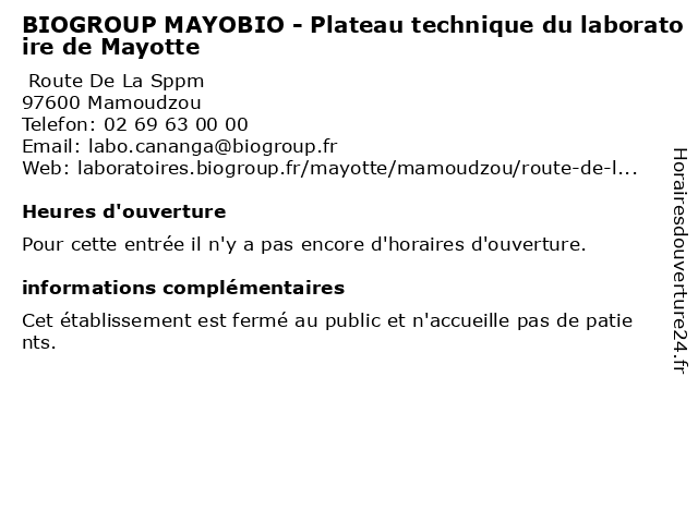 Termes de recherche pour BIOGROUP MAYOBIO - Plateau technique du laboratoire de Mayotte:du, de, laboratoire, technique, plateau, mayotte, biogroup, dépistages, laboratoire de diagnostic, mayobio |