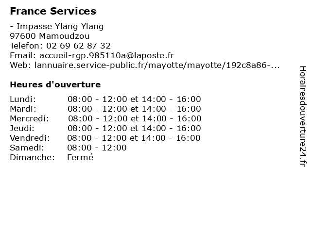 1 France Services (Distance: 1,48 km) - Majikavo Koropa, 97600 Koungou administration, communes, france, service, services, services publics 2 France Services (Distance: 6,22 km) 4 Rue de l'Hôtel de Ville, 97615 Dzaoudzi administration, communes, france, service, services, services publics 3 France Services (Distance: 10,38 km) 14 Route de Coconi, 97680 Tsingoni administration, communes, france, service, services, services publics 4 France Services (Distance: 13,60 km) - Rue de la Convalescence, 97670 Ouangani administration, communes, france, service, services, services publics 5 France Services (Distance: 16,98 km) - Rue de l'artisanat, 97640 Sada administration, communes, france, service, services, services publics 6 France Services (Distance: 18,04 km) 44 Avenue de la Mairie, 97630 Mtsamboro administration, communes, france, service, services, services publics |