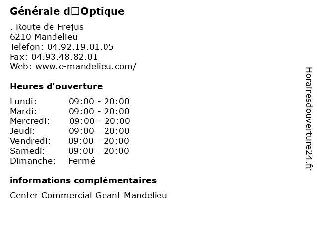 1 Opticien Générale d'Optique MANDELIEU (Distance: 0,49 km) Avenue de Fréjus, 06210 Mandelieu-la-Napoule d'optique, générale, mandelieu, opticien 2 Société Générale (Distance: 0,69 km) 809 Boulevard des Ecureuils, 06210 Mandelieu association d'épargne et de crédit, atm, conseil en crédit, générale, organisme d'assurance auto, organisme d'assurance moto, organisme d'assurance-habitation, organisme d'assurance-vie, société 3 Opticien MANDELIEU Générale d'Optique (Distance: 0,96 km) Avenue de Fréjus Paul Ricard, 06210 Mandelieu-la-Napoule d'optique, examen de la vue, générale, lentilles de contact, lentilles progressives, lunette ray ban, lunettes, lunettes anti-lumière bleue, lunettes de conduite de nuit, lunettes de conduites de nuit, lunettes de soleil, lunettes de soleil pour enfant, lunettes de soleil pour femme, lunettes de soleil pour homme, lunettes de vue, lunettes de vue femme, lunettes de vue homme, lunettes progressives, mandelieu, opticien, opticien proche de chez moi, optique, sport à la vue, vérification de la vue 4 Cabinet médical - Médecine générale et Esthetique (sécrétariat ) (Distance: 1,52 km) 822 av Janvier Passero, 06210 Mandelieu la Napoule cabinet, consultation, docteur, esthetique, et, générale, médecine, médical, santé, sécrétariat 5 Opticien CANNES LES TOURRADES Générale d'Optique (Distance: 2,18 km) Allée Hélène Boucher, 06210 Mandelieu-la-Napoule cannes, d'optique, examen de la vue, générale, lentilles de contact, lentilles progressives, les, lunette ray ban, lunettes, lunettes anti-lumière bleue, lunettes de conduite de nuit, lunettes de conduites de nuit, lunettes de soleil, lunettes de soleil pour enfant, lunettes de soleil pour femme, lunettes de soleil pour homme, lunettes de vue, lunettes de vue femme, lunettes de vue homme, lunettes progressives, opticien, opticien proche de chez moi, optique, sport à la vue, tourrades, vérification de la vue 6 Opticien Générale d'Optique CANNES LES TOURRADES (Distance: 2,18 km) Allée Hélène Boucher, 06210 Mandelieu-la-Napoule cannes, d'optique, générale, les, opticien, tourrades |