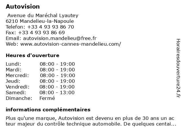 2 Autovision (Distance: 14,58 km) - LA BARRIERE, 83440 MONTAUROUX automobile, autovision, contrôle technique 3 Autovision (Distance: 15,81 km) 22 ZAC DU PILON, 06460 ST VALLIER DE THIEY automobile, autovision, contrôle technique 5 Autovision Auto Bilan Cote D'Azur (Distance: 5,13 km) 101 Avenue Franklin Roosevelt, 06110 Le Cannet auto, autovision, bilan, cote, d'azur 6 Confort Auto / Motor Diag Auto (Distance: 2,13 km) 322 Boulevard Estérel Parc, 06210 Mandelieu auto, automobile, autovision, confort, contrôle technique, diag, motor |