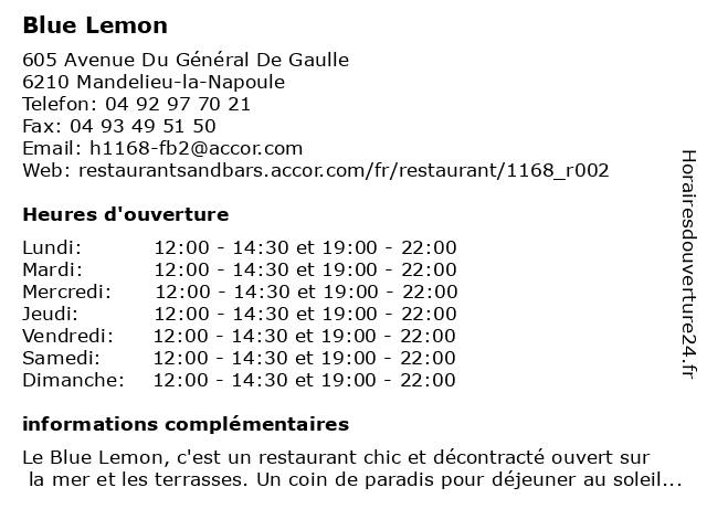 1 Hôtel Pullman Cannes Mandelieu Royal Casino (Restaurant Blue Lemon) (Distance: 0,03 km) 605 Avenue du Général de Gaulle, 06210 Mandelieu-la-Napoule blue, cannes, casino, hebergement, hotel, hôtel, lemon, mandelieu, pullman, restaurant, restauration, royal, tourisme 2 Blue Bar Restaurant (Distance: 5,95 km) 29 Boulevard De La Ferrage, 06400 Cannes bar, blue, restaurant, restaurants 4 Green Acres - Societe Blue Square (Distance: 13,78 km) 14 Avenue G de Maupassant, 06160 Juan Les Pins acres, agency, agent, apartment, blue, green, home, real estate, societe, square 6 Blue Box (Distance: 14,52 km) . Chemin des Sables, 06000 Antibes blue, box, enfants, homme, mode femme  |