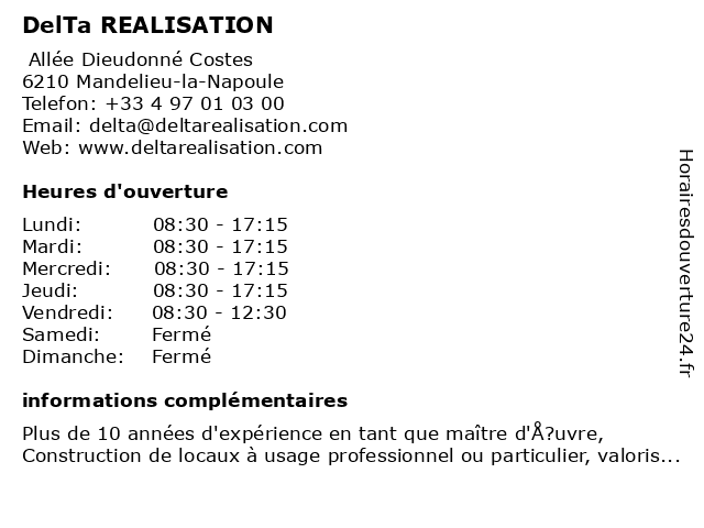 1 Delta Machine (Distance: 5,16 km) 13 Rue Hoche, 06400 Cannes accessoires, boutique, delta, machine, mode, vêtements 3 Chubb Delta (Distance: 10,51 km) 25 Allée Pierre Ziller, 06560 Valbonne alarme, chubb, delta, détection, protection, security, solutions, sécurité, sûreté, télévidéosécurité 4 SARL Faure Charpente Realisation - FCR (Distance: 11,14 km) 29 Ancien Chemin de Montmeyan, 06130 Grasse bardage, charpente, couverture, entretien toitures, faure, fcr, isolation extérieur, pose de velux, realisation, sarl, zinguerie 5 SARL Delta Technique Marrou Franck (Distance: 20,66 km) 46 Avenue des Tuilières, 06800 Cagnes-sur-Mer delta, franck, marrou, sarl, technique 6 Grand Delta Habitat (Distance: 24,33 km) 455 promenade des Anglais, 06200 Nice accession, bailleurs, delta, grand, habitat, location, logement, office, social |