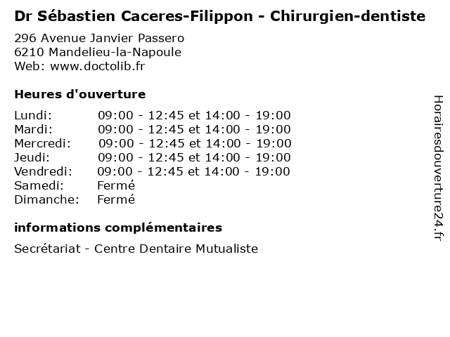| Lundi | 09:00-12:45 et 14:00-19:00 |