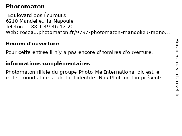 1 Photomaton (Distance: 0,77 km) 21 Route de Fréjus, 06210 Mandelieu casino, centre, commercial, geant, madelieu, photomaton 6 |