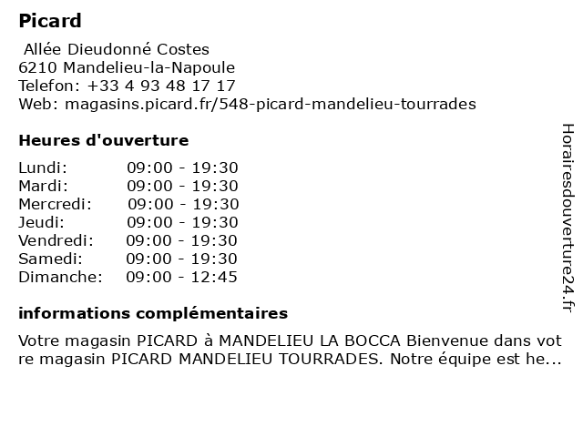 Votre magasin PICARD à MANDELIEU LA BOCCA Bienvenue dans votre magasin PICARD MANDELIEU TOURRADES. Notre équipe est heureuse de vous accueillir et pourra vous conseiller avec professionnalisme et...