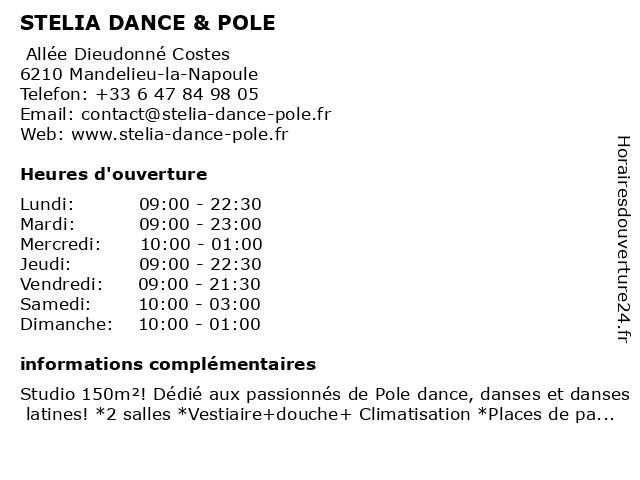 1 Strace Dance Center (Distance: 0,33 km) 85 Allée Louis Blériot, 06210 Mandelieu-la-Napoule center, cours, culture, dance, mandelieu-la-napoule, strace, équipe 2 Gwladys Dance Studio (Distance: 5,45 km) 1245 Avenue de la Plaine, 06250 Mougins cours, dance, danse, gwladys, mougins, services, studio, école 3 MOOVIN DANCE STUDIO (Distance: 10,76 km) 63 Avenue de la Libération, 06130 Grasse cabaret, dance, jazz, moovin, ragga, studio, école de danse 4 Gwladys Dance Studio (Distance: 11,54 km) 33 Route de Saint-Mathieu, 06130 Grasse dance, gwladys, studio 5 Pharmacie du Pole Sante (Distance: 18,70 km) 53 Avenue des Alpes, 06800 Cagnes sur mer du, giphar, pharmacie, pharmacien, pole, sante, services 6 Pole Medical Epsilon 3 (secrétariat ) (Distance: 18,92 km) 87 Avenue Archimed, 83700 Saint Raphael consultation, docteur, epsilon, medical, médecins, pole, santé, secrétariat |