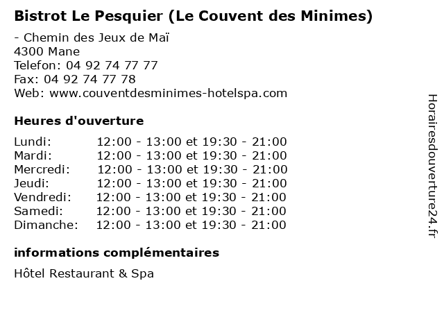 1 Restaurant Le Cloître (Le Couvent des Minimes) (Distance: 0,00 km) - Chemin des Jeux de Mai, 04300 Mane bar, cloître, couvent, des, diner, déjeuner, et, hotel, le, minimes, restaurant, réunions, évenements 2 Hôtel & Spa le Couvent des Minimes (Distance: 0,01 km) - Chemin des Jeux de Mai, 04300 Mane bar, couvent, des, hotel, hôtel, le, minimes, restaurant, réunions, spa, évenements 3 Hôtel & Spa le Couvent des Minimes (Le Bar) (Distance: 0,01 km) - Chemin des Jeux de Mai, 04300 Mane bar, couvent, des, horaires, hotel, hôtel, le, minimes, restaurant, réunions, spa, évenements 4 Le Bistrot de Pierrerue (Distance: 5,18 km) - Rue de la Fenaille, 04300 Pierrerue bar, bistrot, brunch, de, le, pierrerue, restaurant, restauration 6 Au Bistrot Provençal (Distance: 9,34 km) - Avenue des Farigoules, 04130 Volx au, bistrot, largue, provencal, provençal, restaurants |