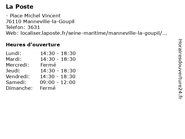 1 La Poste (Distance: 4,06 km) 4 Rue de la Poste, 76110 Goderville express chronopost, la, poste, réexpédition internationale 3 La Poste (Distance: 5,63 km) 2 Place Saint Jacques, 76430 Etainhus express chronopost, la, poste, réexpédition internationale 4 La Poste (Distance: 5,65 km) 5 Place de l'Eglise, 76430 Sainneville express chronopost, la, poste, réexpédition internationale 5 La Poste (Distance: 6,12 km) - Route du Pont, 76110 Bretteville-du-Grand-Caux express chronopost, la, poste, réexpédition internationale 6 La Poste (Distance: 8,87 km) - Le Bourg, 76210 Nointot agence, assurance, banque, banque postale, bureau de poste, chronopost, colis, courrier, dps, expéditions internationales, la, point, postale, poste, relais, timbres, téléphonie, ups, western union |