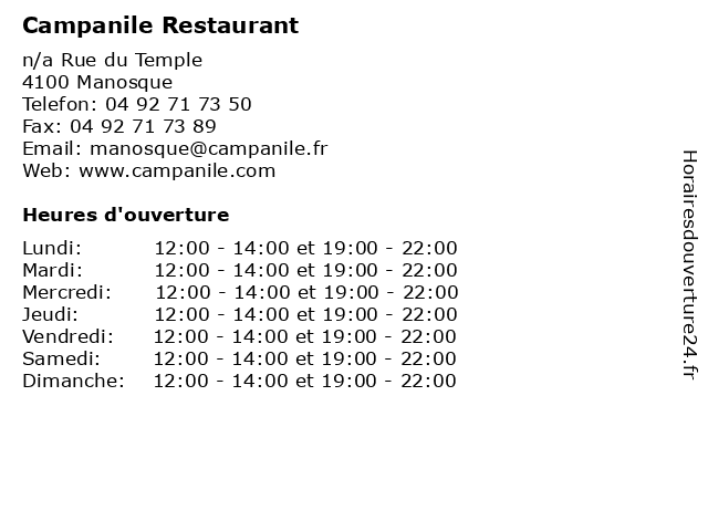 1 Hôtel Campanile (Distance: 0,11 km) . Rue du Temple, 04100 Manosque bar, campanile, hotel, hôtel, restaurant, réunions, évenements 2 Campanile Digne Les Bains (Distance: 40,59 km) . Quartier St Christophe, 04000 Digne-les-Bains bains, bar, campanile, digne, hotel, les, restaurant, service 3 Hôtel Campanile (Distance: 43,52 km) - P.A Technologiques de la Sainte Victoire, 13590 Meyreuil bar, campanile, hotel, hôtel, restaurant, réunions, évenements 4 Hôtel Campanile - Le Restaurant (Distance: 45,60 km) 1 rue Jean Andreani, 13090 Aix-en-Provence bar, campanile, déjeuner, dîners, et, hotel, hôtel, le, restaurant, réunions, évenements 5 Hôtel Campanile - Le Restaurant (Distance: 45,77 km) 80 route de Valcros, 13090 Aix-en-Provence bar, campanile, déjeuner, dîners, et, hotel, hôtel, le, restaurant, réunions, évenements 6 Hôtel Campanile (Distance: 45,77 km) 80 Route de Valcros, 13090 Aix-en-Provence bar, campanile, hotel, hôtel, restaurant, réunions, évenements |