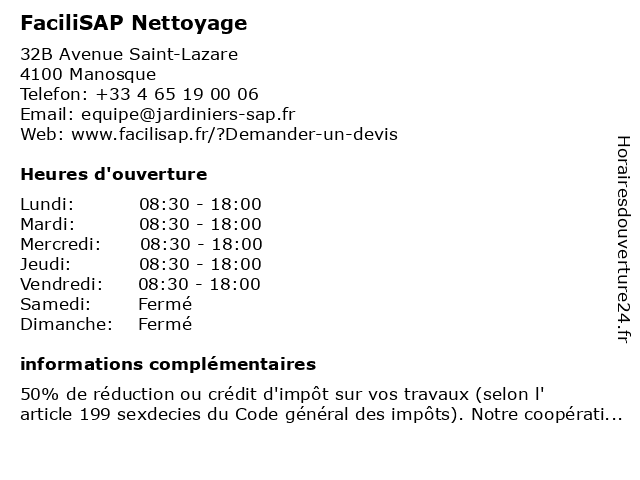 2 FaciliSAP jardinage RIANS (Distance: 38,66 km) 1872 Route de Rians, 83470 Ollières facilisap, jardinage, rians 3 FaciliSAP Nettoyage DIGNE LES BAINS (Distance: 46,24 km) 3 Rue de la Grande Fontaine, 04000 Digne-les-Bains bains, digne, facilisap, les, nettoyage 4 FaciliSAP Informatique AIX-EN-PROVENCE (Distance: 46,35 km) 785 Route des Milles, 13290 Aix-en-Provence aix, en, facilisap, informatique, provence 5 FaciliSAP Nettoyage CARBIERES D'AVIGNON (Distance: 51,64 km) 254 Chemin des Pasquiers, 84220 Cabrières-d'Avignon carbieres, d'avignon, facilisap, nettoyage 6 FaciliSAP Bricolage BOUC BEL AIR (Distance: 53,64 km) 71 Rue des Cèdres, 13320 Bouc-Bel-Air air, bel, bouc, bricolage, facilisap |