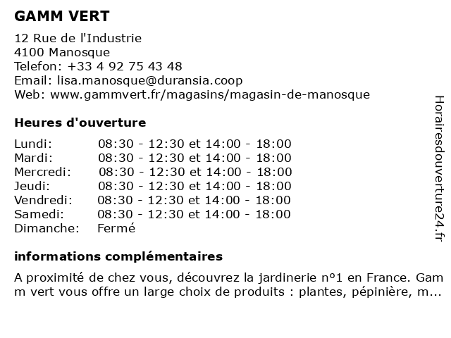 2 Citron Vert (Distance: 0,48 km) 180 Boulevard Ryckebusch, 04100 Manosque beauté, citron, cosmétique, institut, maquillage, parfum, soins, vert 3 GAMM VERT (Distance: 28,53 km) 193 Rue Benjamin Franklin, 84120 Pertuis animalerie, gamm, jardin, jardinerie, mobilier de jardin, plantes, pépinière, vert 4 Gamm vert (Distance: 39,75 km) . DE ST MAXIMIN, 83470 ST MAXIMIN LA STE BAUME animalerie, animaux, gamm, horticulteur, jardin, jardinerie, vert 5 GAMM VERT (Distance: 41,38 km) 26 Rue de la Provence, 83470 Saint-Maximin-la-Sainte-Baume animalerie, gamm, jardin, jardinerie, mobilier de jardin, plantes, pépinière, vert 6 |