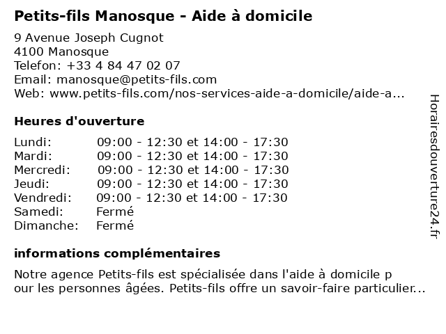 | 1 Marcel & Fils (Distance: 0,93 km) 101 Avenue Maréchal de Lattre de Tassigny, 04100 Manosque bio, cuisine, fils, magasin, marcel, produits, repas, restaurants 2 Association d'Aide à Domicile la Populaire Manosque (Distance: 1,76 km) 22 Avenue Jean Giono, 04100 Manosque association, d'aide, domicile, la, manosque, populaire 5 Alu-Pere Et Fils (Distance: 10,00 km) Chemin des Grandes Vignes, 04300 Saint-Maime alu, et, fils, pere 6 |
