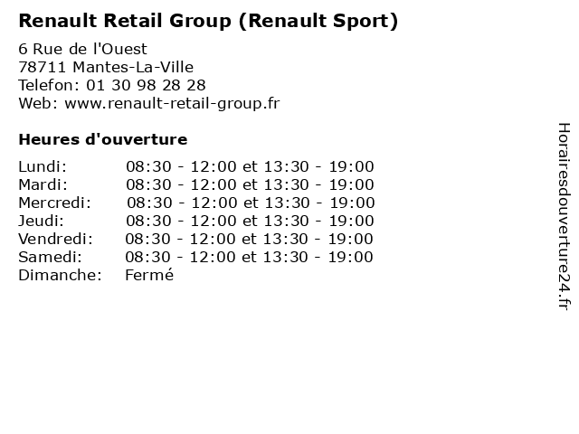 1 Renault Retail Group ( Assistance) (Distance: 0,00 km) 6 Rue de l'Ouest, 78711 Mantes-La-Ville assistance, automobiles, garage, group, motos - concessionnaire, renault, retail 2 Renault Retail Group (Distance: 0,00 km) 6 Rue de l'Ouest, 78711 Mantes-La-Ville automobiles, garage, group, motos - concessionnaire, renault, retail 3 Renault Retail Group (Dacia Box) (Distance: 0,00 km) 6 Rue de l'Ouest, 78711 Mantes-La-Ville automobiles, box, dacia, garage, group, motos - concessionnaire, renault, retail 4 Renault Retail Group (Véhicule Neuf) (Distance: 0,00 km) 6 Rue de l'Ouest, 78711 Mantes-La-Ville automobiles, garage, group, motos - concessionnaire, neuf, renault, retail, véhicule 5 Renault Retail Group (Véhicule d'Occasion) (Distance: 0,00 km) 6 Rue de l'Ouest, 78711 Mantes-La-Ville automobiles, d'occasion, garage, group, motos - concessionnaire, renault, retail, véhicule 6 Renault Retail Group (Z.E Véhicule Electrique) (Distance: 0,00 km) 6 Rue de l'Ouest, 78711 Mantes-La-Ville automobiles, electrique, garage, group, motos - concessionnaire, renault, retail, véhicule, z.e |