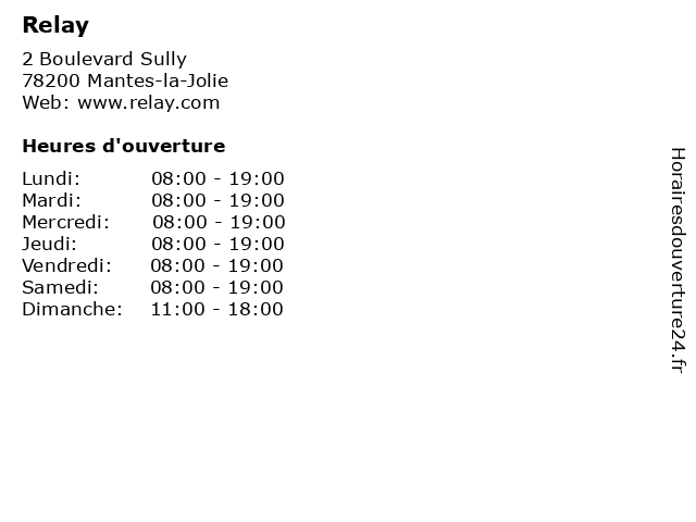 1 Relay (Distance: 3,13 km) n/a Place de la Gare, 78200 Mantes La Jolie beverages, food, gifts, paper, printing, relay, service products, telephone 2 Relay (Distance: 17,67 km) n/a place de la Gare, 27200 Vernon beverages, food, gifts, paper, printing, relay, service products, telephone 3 Mondial Relay (Distance: 14,39 km) 36 Avenue du Général de Gaulle, 27600 Gaillon mondial, poste, relay, services, services à la personne 4 Relay (Distance: 30,94 km) n/a R.Fours A Chaux, 78700 Conflans Saint Honorine beverages, food, gifts, paper, printing, relay, service products, telephone 5 Relay (Distance: 47,59 km) n/a Boulevard Grenelle, 75015 Paris beverages, food, gifts, paper, printing, relay, service products, telephone 6 Relay (Distance: 49,78 km) n/a Duroc, 75007 Paris beverages, food, gifts, paper, printing, relay, service products, telephone |
