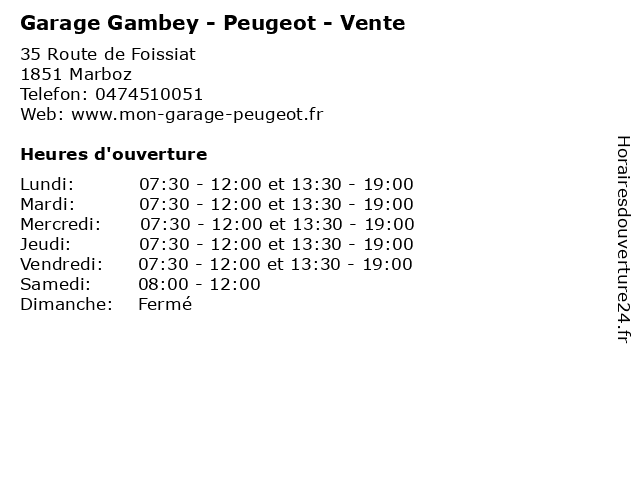 1 Garage Gambey - Peugeot - Après vente (Distance: 0,00 km) 35 route de Foissiat, 01851 Marboz après, automobile, entretien, gambey, garage, neuf, occasion, peugeot, réparation, vente, vidange 2 Peugeot (Distance: 4,57 km) 35 Route De Foissiat, 01851 Marboz automobiles, concéssionnaire, garage, motos, peugeot 3 Station Elan - Garage Gambey (Distance: 9,88 km) 35 route de Foissiat, 01851 Marboz carburants, diesel, elan, essence, gambey, garage, sp95, station 4 BMW Bresse Auto Sport - Service après-vente (Distance: 15,45 km) 40 rue Gay Lussac, 01440 Viriat après, auto, automobile, bmw, bresse, concessionnaire, entretien, neuve, occasion, réparation, service, sport, vente 5 Peugeot Bourg en bresse (Vente véhicules) (Distance: 17,52 km) 192 Boulevard de Brou, 01000 Bourg en bresse bourg, bresse, en, peugeot, services, vente, véhicules 6 Peugeot Bourg en bresse (Atelier) (Distance: 17,52 km) 192 Boulevard de Brou, 01000 Bourg en bresse atelier, bourg, bresse, en, peugeot, services, véhicules  |