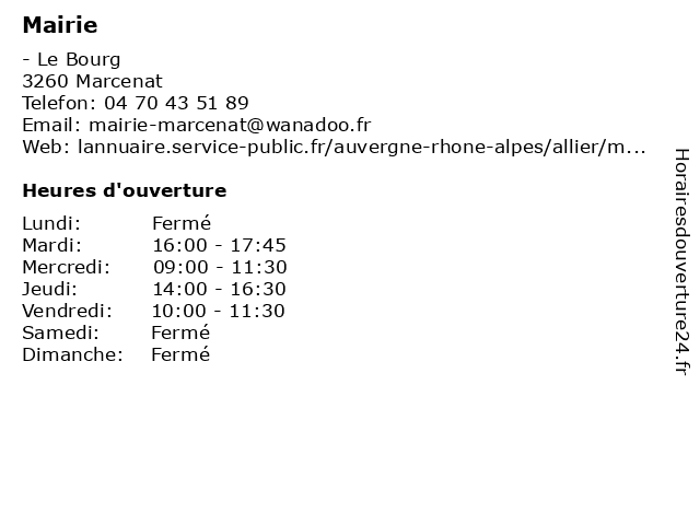 2 Mairie de Marcenat (Distance: 0,00 km) 3 Place de la Mairie, 15190 Marcenat administration, de, mairie, marcenat, service public 3 Mairie de Chanterelle (Distance: 11,43 km) 1 route de Condat, 15190 Chanterelle administration, chanterelle, de, mairie, public, service 4 Mairie du Monteil (Distance: 25,89 km) n/a Le Bourg, 15240 Le Monteil administration, du, mairie, monteil, service public 5 Mairie de Souel (Distance: 28,37 km) . Le Bourg, 81170 Souel administration, assoc public, de, mairie, souel 6 Mairie du Mont-Dore (Distance: 30,12 km) 1 Rue Côte-Boissy, 63240 Mont-Dore administration, assoc public, dore, du, mairie, mont |