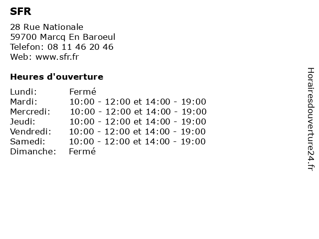1 SFR (Distance: 0,04 km) 28 Rue nationale, 59700 Marcq En Baroeul compagnie de téléphone, magasin de téléphones mobiles, sfr, vente et installation du câble et du satellite 2 SFR (Distance: 3,36 km) - Euralille, 59000 Lille abonnements de téléphonie mobile ou fixe fixe ou carte prépayée, accès internet haut débit ou la fibre optique ainsi que des abonnements à des bouquets de chaînes de télévision ., sfr, téléphones mobiles 3 SFR (Distance: 4,27 km) . Avenue du grand Cottignies, 59290 Wasquehal beaute, cafe, chaussures, enfants, hommes, lingerie, mode femmes, restaurant, sfr, sport 4 SFR (Distance: 4,85 km) 63 Rue des Postes, 59000 Lille abonnements de téléphonie mobile ou fixe fixe ou carte prépayée, accès internet haut débit ou la fibre optique ainsi que des abonnements à des bouquets de chaînes de télévision ., sfr, téléphones mobiles 5 SFR (Distance: 5,89 km) 2 Villeneuuve, 59650 Villeneuve D'Ascq beaute, boutiques, brasserie, cache, chaussures, concorde, deco, enfants, mode femme, mode hommes, restaurant, sfr, sport 6 |