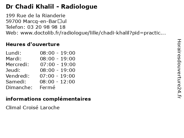 1 Dr Chadi Khalil - Radiologue (Distance: 1,55 km) 21 Rue de la Briqueterie, 59700 Marcq-en-Barœul chadi, dr, khalil, médecins, médicaments, radiologue, santé, secrétariat, spécialiste 2 Dr Chadi Khalil - Radiologue (Distance: 2,51 km) 26 Rue du Ballon, 59800 Lille chadi, dr, khalil, médecin, médecine, médical, pharmaceutique, radiologue, secretariat, secrétariat, traitement 3 Dr Chadi Khalil - Radiologue (Distance: 4,89 km) 73 Rue Jacquemars Giélée, 59000 Lille chadi, dr, khalil, médecins, médicaments, radiologue, santé, secrétariat, spécialiste 4 Dr Chadi Khalil - Radiologue (Distance: 13,57 km) - Avenue de la République, 59113 Seclin chadi, dr, khalil, médecins, médicaments, radiologue, santé, secrétariat, spécialiste 5 Dr Khalil Bichra - Médecin généraliste (Distance: 5,84 km) 85 Rue de l'Abbé Aerts, 59000 Lille bichra, consultation, docteur, dr, généraliste, khalil, med, médecin, médecine, secrétariat, traitement 6 Dr Chadi Damaj - Urologue (Distance: 59,44 km) - Route de Blendecques, 60357 Helfaut andrologie, andrologue, centre, chadi, damaj, de, dr, hospitalier, la, omer, région, saint, urologique, urologue |