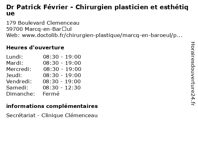 1 Dr Frédéric Laurent - Chirurgien plasticien et esthétique (Distance: 0,00 km) 179 Boulevard Clemenceau, 59700 Marcq-en-Barœul chirurgien, dr, esthétique, et, frédéric, laurent, plasticien 2 Dr. Joseph Mellul- Chirurgien plasticien (Distance: 3,82 km) 146 rue de Paris,, 59000 Lille chirurgien, consultation, docteur, dr., joseph, mellul, plasticien, santé 3 Dr Clothilde Calibre - Chirurgien plasticien et esthétique (Distance: 7,09 km) - Rue Michel Polonowski, 59037 Lille brule, calibre, chirurgien, clothilde, dr, esthétique, et, hôpital, plasticien, plastique, salengro, soins 4 Pr Véronique Martinot - Chirurgien plasticien et esthétique (Distance: 7,69 km) - Avenue du Professeur Emile Laine, 59037 Lille beaute, chirurgien, chiurgie, esthétique, et, hôpital, martinot, plasticien, plastique, pr, salengro, véronique 5 Dr Anissa Belkhou - Chirurgien plasticien et esthétique (Distance: 7,69 km) - Avenue du Professeur Emile Laine, 59037 Lille anissa, beaute, belkhou, chirurgien, chiurgie, dr, esthétique, et, hôpital, plasticien, plastique, salengro 6 Dr Pierre Faglin - Chirurgien plasticien et esthétique (Distance: 7,69 km) - Avenue du Professeur Emile Laine, 59037 Lille beaute, chirurgien, chiurgie, dr, esthétique, et, faglin, hôpital, pierre, plasticien, plastique, salengro |