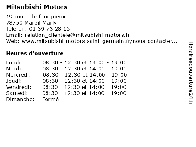 1 Mitsubishi Motors (Distance: 11,43 km) 72 Route de Pontoise, 95100 Argenteuil accessoires, atelier, automobiles, garage, mitsubishi, motors, motos - concessionnaire 2 Mitsubishi Motors (Distance: 15,68 km) 20 Rue Guersant, 75017 Paris accessoires, atelier, automobiles, garage, mitsubishi, motors, motos - concessionnaire 3 Mitsubishi Motors (Distance: 16,64 km) 11 Rue Louis Delage, 95310 Saint-Ouen-l'Aumône mitsubishi, motors 4 Kia Rousseau Motors Chambourcy (Distance: 2,87 km) 32 Route de Mantes, 78240 Chambourcy chambourcy, kia, motors, rousseau 5 Kia Rousseau Motors Chambourcy (Distance: 2,88 km) 32 Route de Mantes, 78240 Chambourcy chambourcy, kia, motors, rousseau 6 MITSUBISHI CLIMATISATION (Distance: 10,50 km) 13 Rue Saint-Honoré, 78000 Versailles climatisation, mitsubishi  |