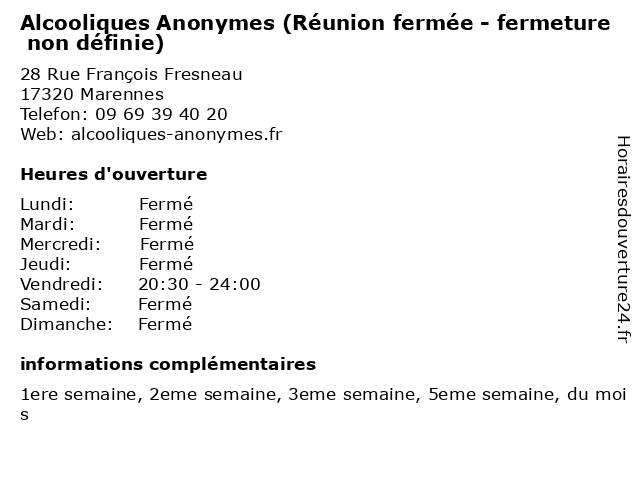 1 Alcooliques Anonymes (Réunion fermée - fermeture non définie) (Distance: 17,24 km) 17 Rue Jean Jaurès, 17300 Rochefort alcooliques, anonymes, définie, fermeture, fermée, non, réunion 2 Alcooliques Anonymes (Réunion ouverte - fermeture non définie) (Distance: 0,00 km) 28 Rue François Fresneau, 17320 Marennes alcooliques, anonymes, définie, fermeture, non, ouverte, réunion 3 Alcooliques Anonymes (Ouverte à tout public - fermeture non définie) (Distance: 0,00 km) 28 Rue François Fresneau, 17320 Marennes alcooliques, anonymes, définie, fermeture, non, ouverte, public, réunion, tout 4 Alcooliques Anonymes (Ouverte à tout public - fermeture non définie) (Distance: 17,22 km) 17 Rue Jean Jaurès, 17300 Rochefort alcooliques, anonymes, définie, fermeture, non, ouverte, public, réunion, tout 5 Alcooliques Anonymes (Réunion ouverte - fermeture non définie) (Distance: 17,24 km) 17 Rue Jean Jaurès, 17300 Rochefort alcooliques, anonymes, définie, fermeture, non, ouverte, réunion 6 Alcooliques Anonymes (Ouverte à tout public - fermeture non définie) (Distance: 21,35 km) - Place Richelieu, 17600 Saujon alcooliques, anonymes, définie, fermeture, non, ouverte, public, réunion, tout |