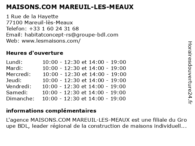 | Dimanche | 10:00-12:30 et 14:00-19:00 |